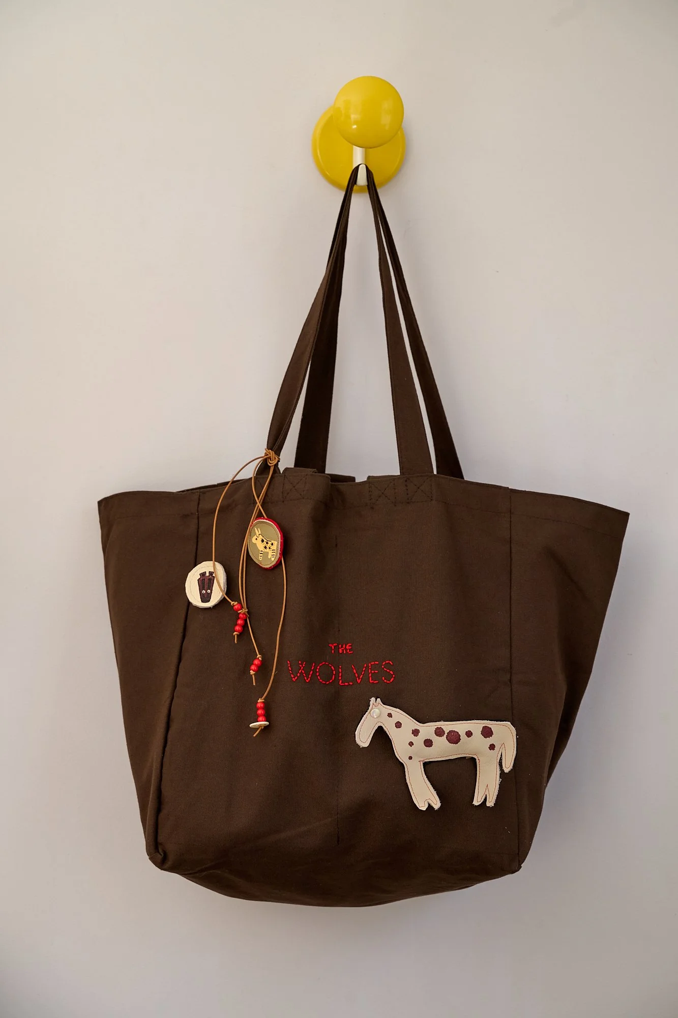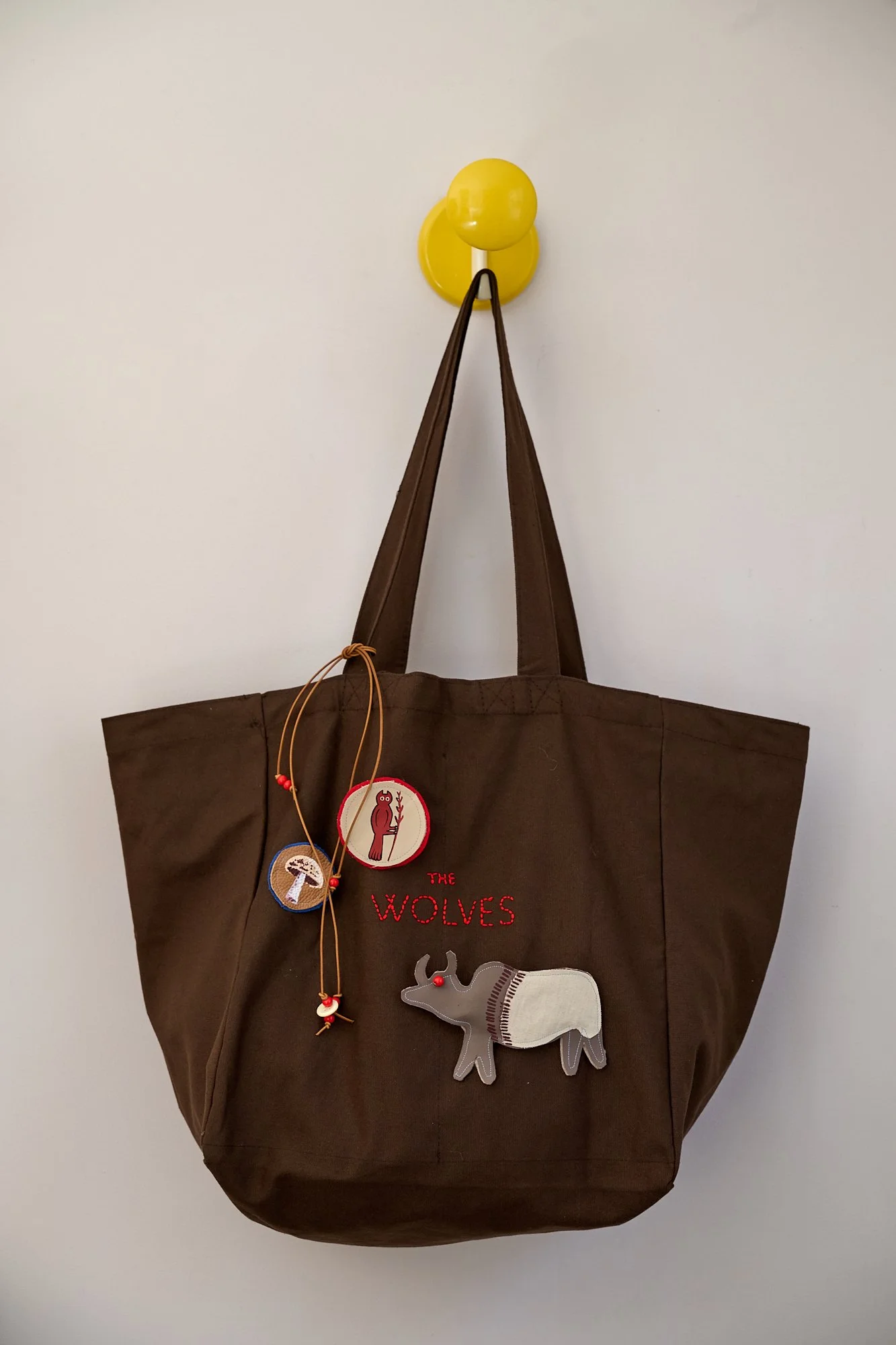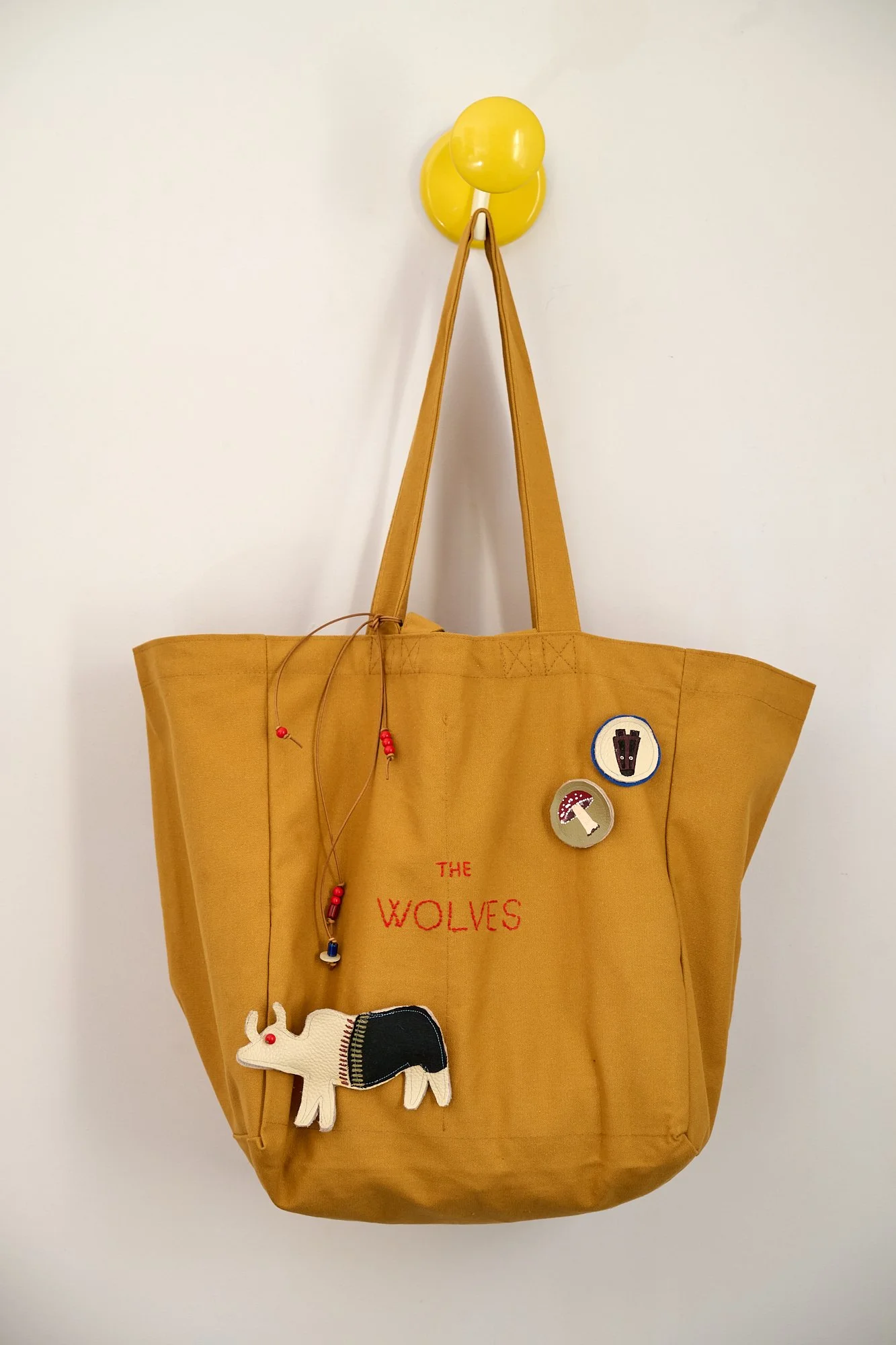 Outside there is a hand embroidered The Wolves logo, and three detachable brooches, one large padded sewn scrap leather or fabric Spirit Animal and two smaller hand painted on leather, or a ribbon. Finished with beaded leather ties to the strap.