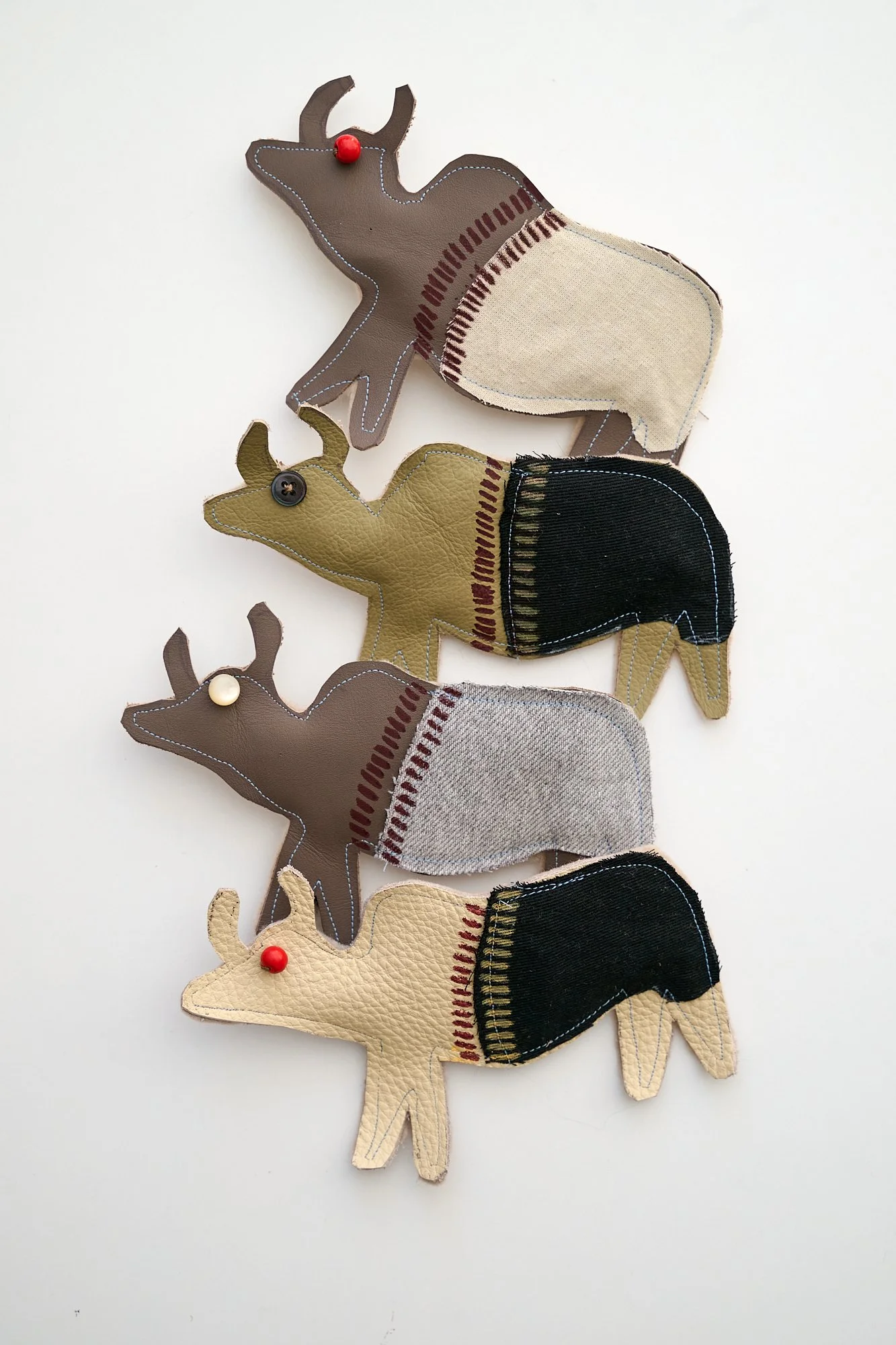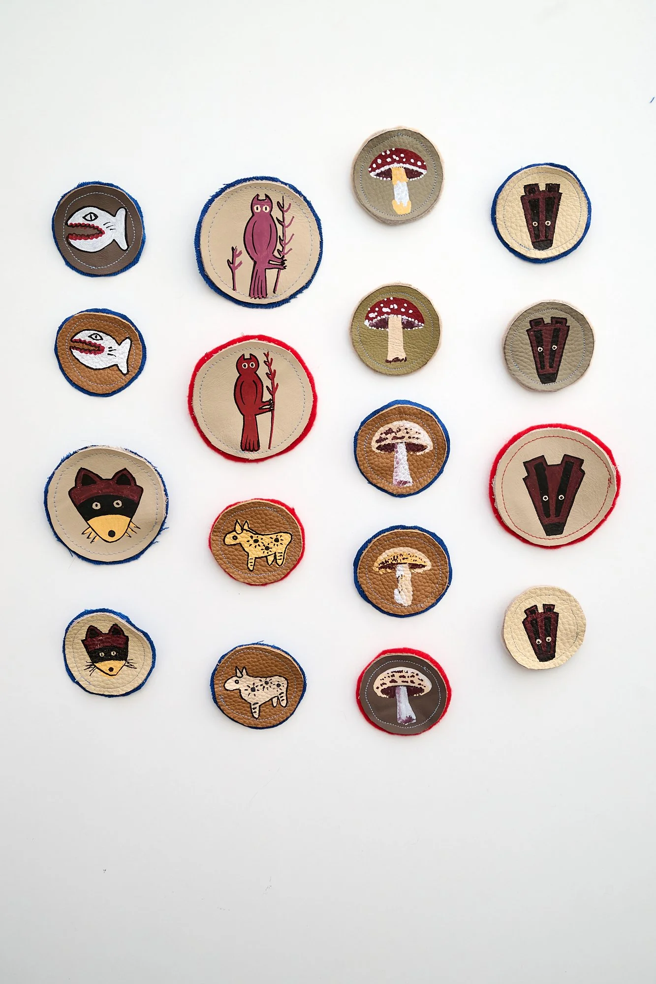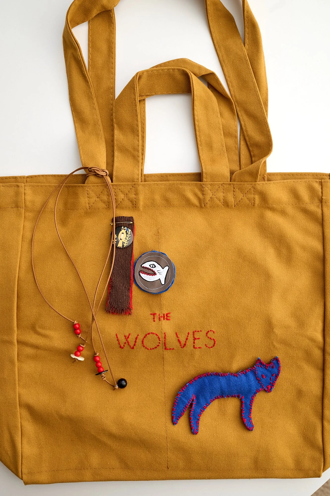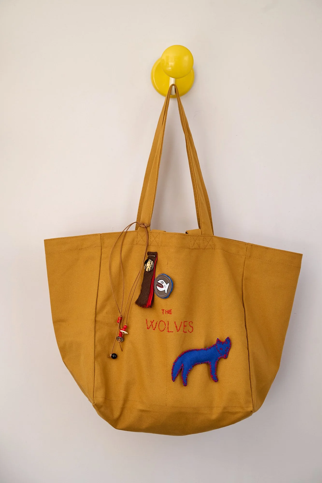 Outside there is a hand embroidered The Wolves logo, and three detachable brooches, one large padded sewn scrap leather or fabric Spirit Animal and two smaller hand painted on leather, or a ribbon. Finished with beaded leather ties to the strap.