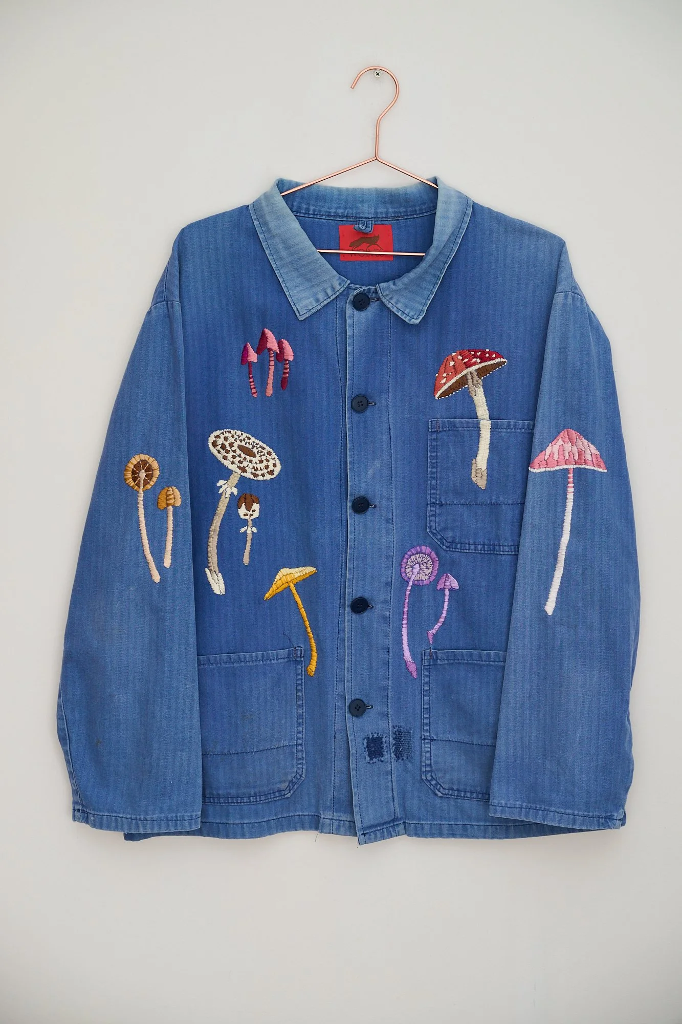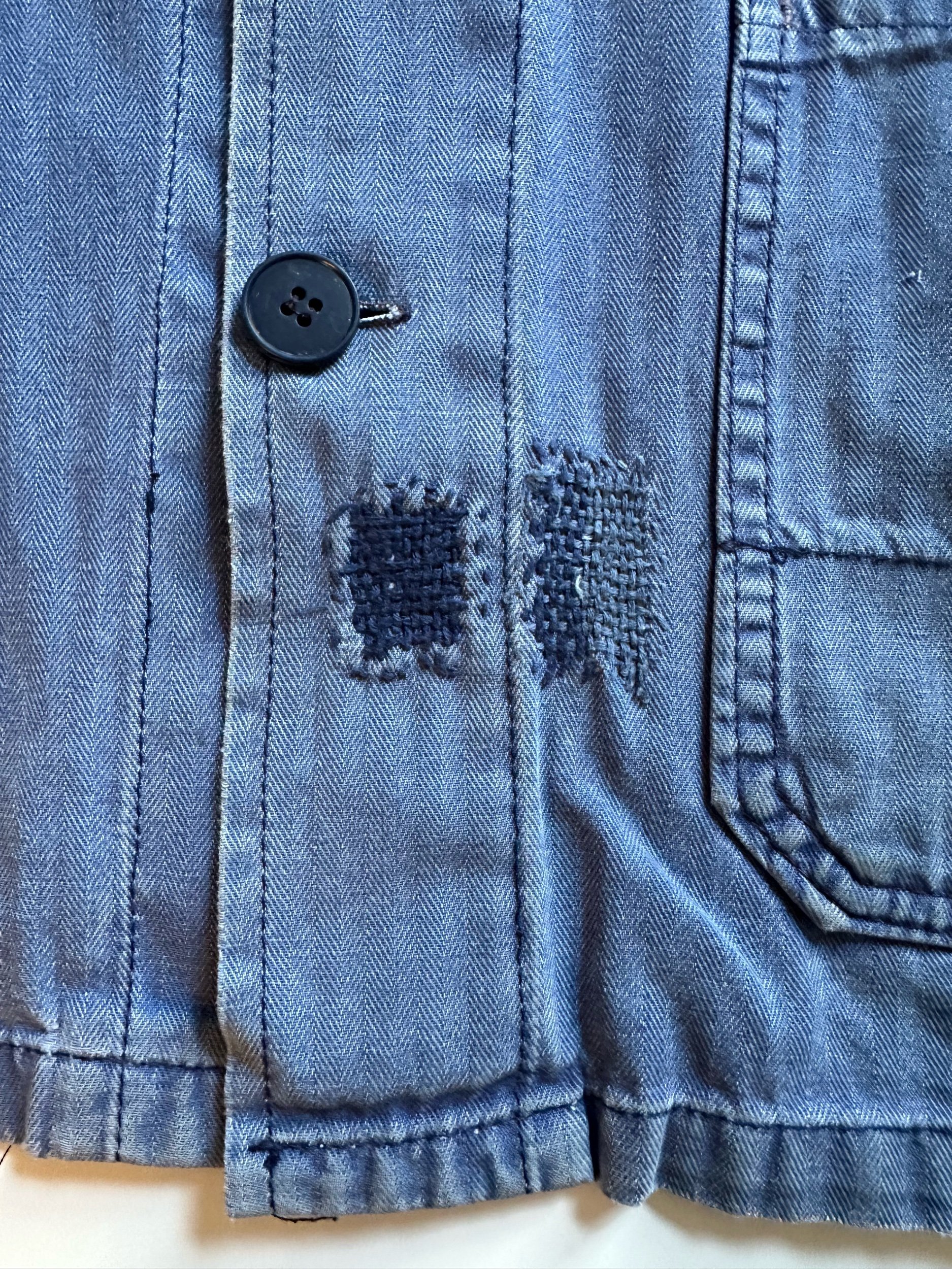 Really lovely Herringbone vintage work jacket, mid blue and amazing condition, with a few beautifully stitched mends.