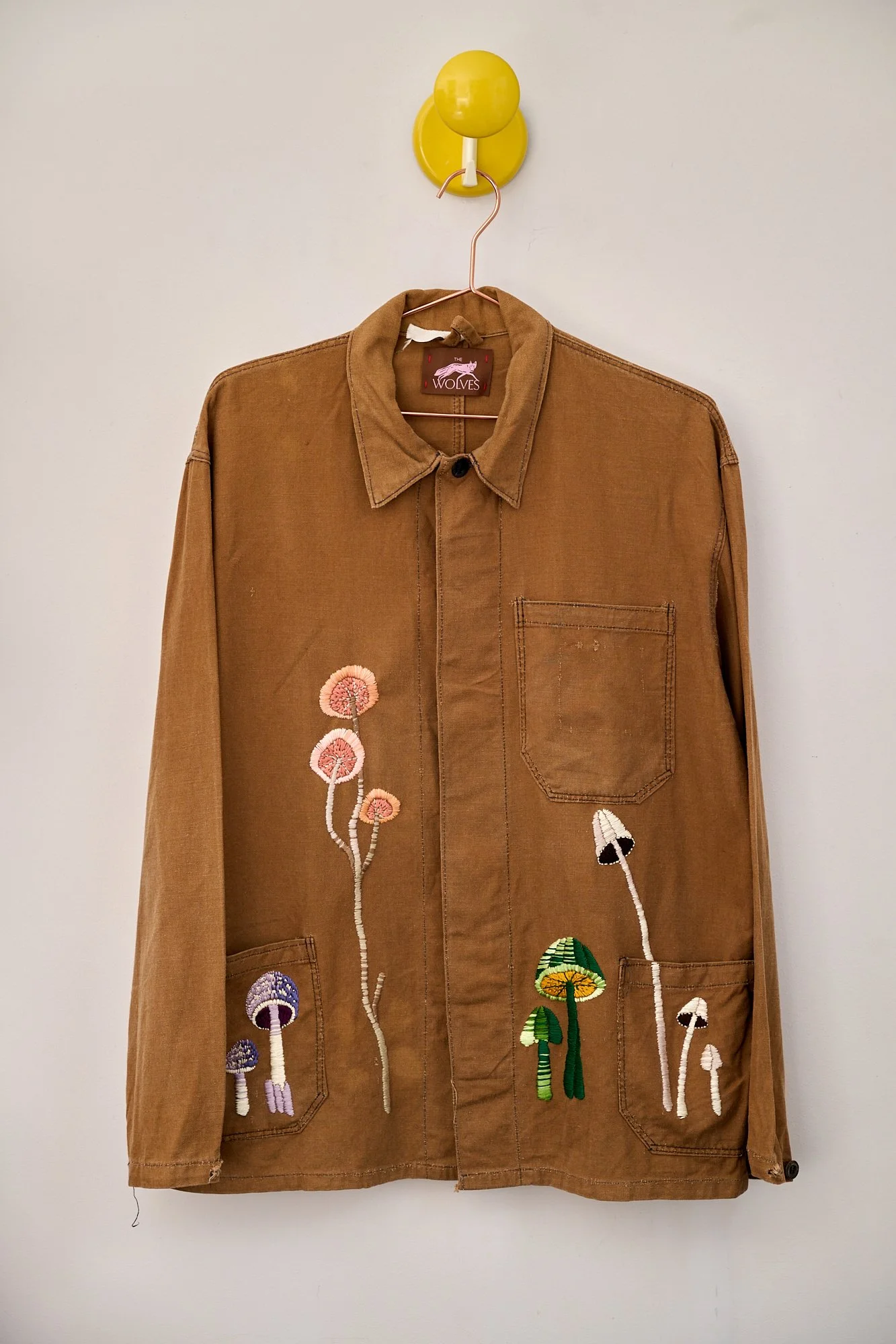3: caramel colour are workwear jacket, in size M, with hand embroidery to the front. Pit to pit 23 inches, length 29 in.